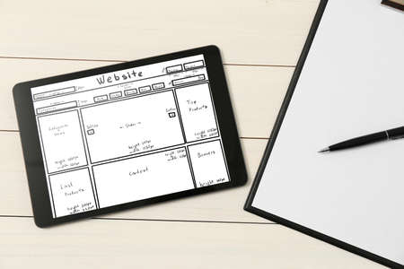 Clipboard and tablet with sketch of website planning and design on white wooden table, flat lay