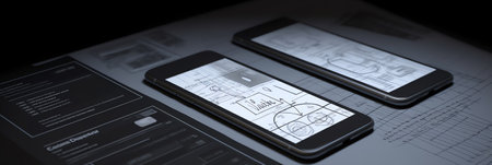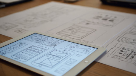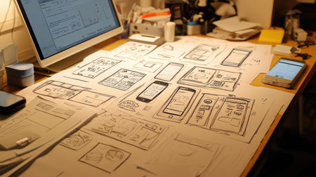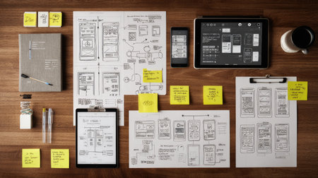 An organized workspace featuring sketches, digital devices, and creative tools used in mobile app design. The scene showcases the design process, highlighting brainstorming and planning with effective visual aids.