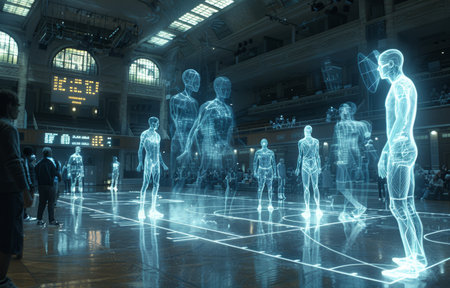 Holographic figures playing basketball in a high-tech indoor arena, showcasing futuristic sports technology with an audience in the background.