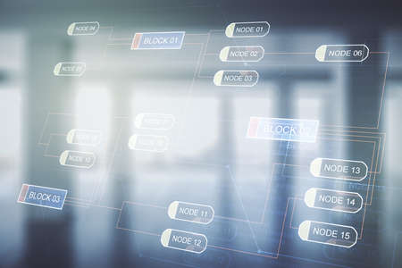 Abstract virtual coding illustration on modern interior background, software development concept. Multiexposure
