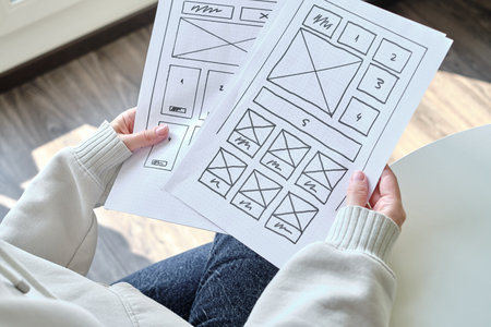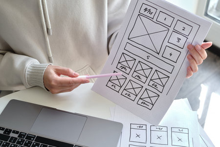 Woman designer create website design wireframe. Sketch, prototype, framework, layout future design project. UI and UX - user interface, user experience designer. Creative concept