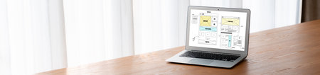 A stylish modern workspace featuring a laptop displaying a detailed flowchart, surrounded by greenery and a steaming coffee mug, perfect for inspiration and productivity.
