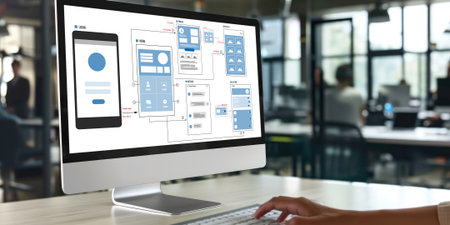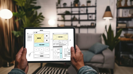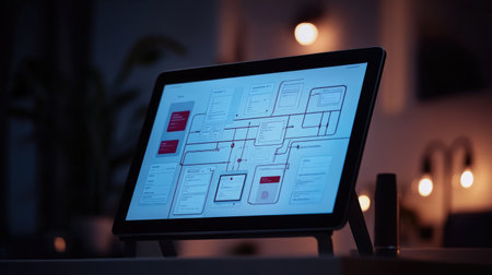 A modern tablet screen displays a detailed digital interface design highlighting data flow and user experience. Soft ambient lighting sets a creative workspace atmosphere.