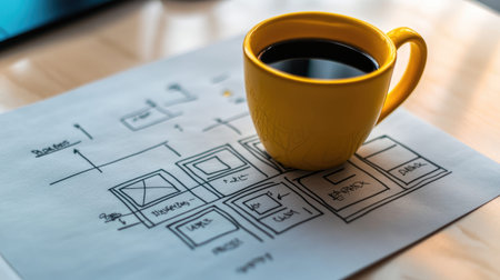 A vibrant yellow coffee mug rests beside blueprints and sketches, reflecting a creative workspace focused on planning and design. Ideal for artistic and workspace themes.