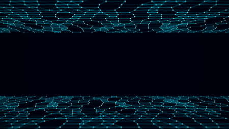 Abstract Futuristic 3d Render Illustration. Plexus polygonal background. Wireframe landscape concept. Dark sci-fi backdrop. Dots and lines connections. Space surface. Big data macro wireframe.