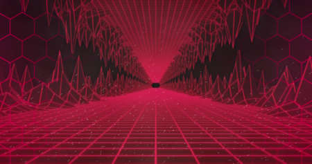 Abstract technology grid or surface background with colorful wave or terrain, triangular cells and vibrant 80s styled neon colors