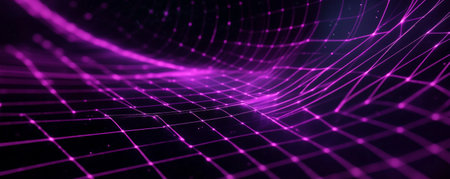 Abstract partially blurred background, polygonal grid of neon pink and blue colors on black background. Copy space. 3d render