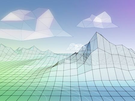 Minimalist wireframe landscape with pastel colors. 3D illustration
