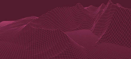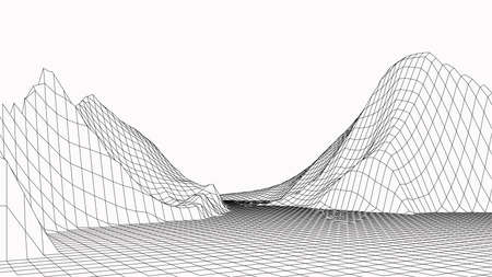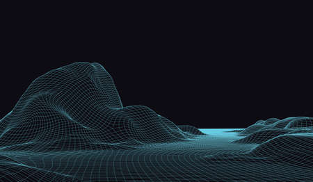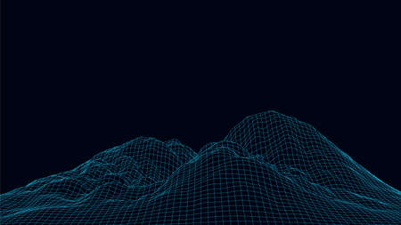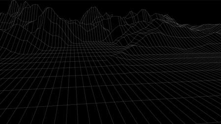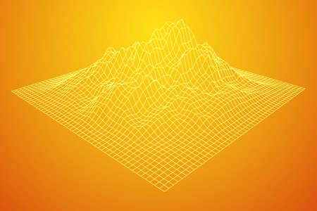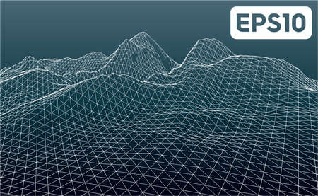 Wireframe 3D landscape mountains. Wireframe landscape wire. 3d landscape. Digital retro landscape cyber surface. Vector illustration.