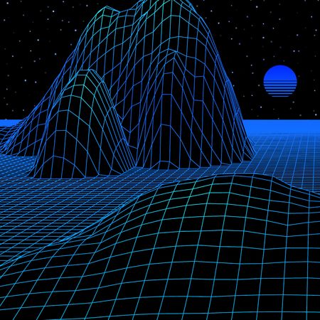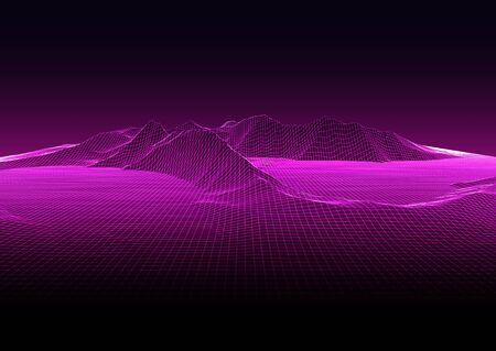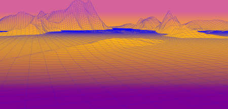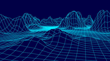 Abstract vector wireframe landscape background. 3D futuristic mesh mountains. 80s Retro illustration. Cyberspace technology valleys.