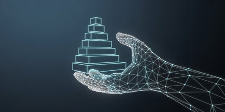 A glowing wireframe hand supports a stacked geometric pyramid shape made of layered rectangles against a dark background.