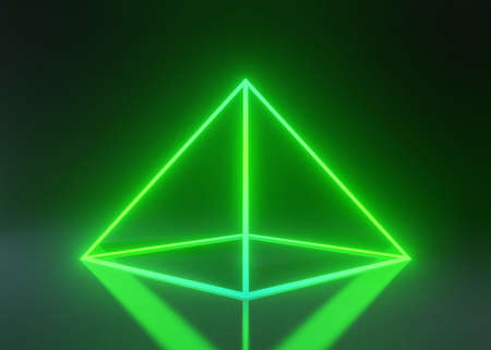 Neon pyramid in space. Futuristic background. 3d rendering