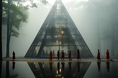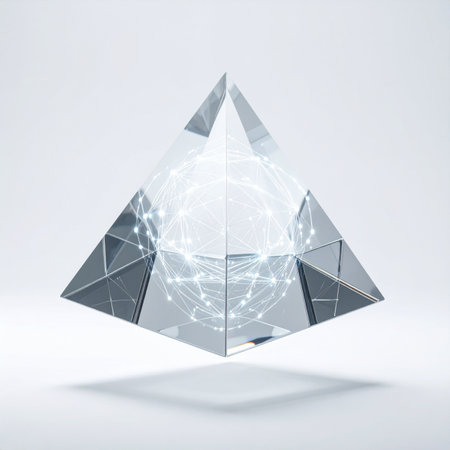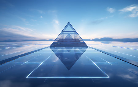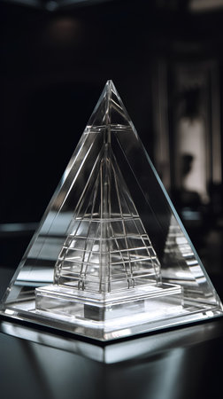 A captivating transparent pyramid structure glows with illuminated edges against a dark background, showcasing modern design and artistic elegance.