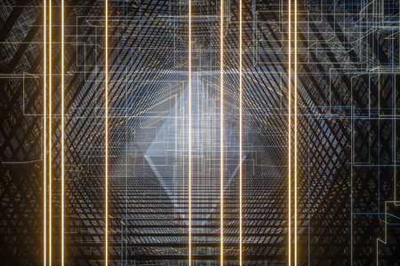 Abstract technological background with pyramids and lights. 3D Rendering