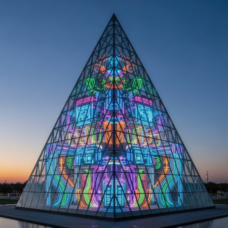 Geometric pyramid sculpture glows with neon light in the desert at twilight.