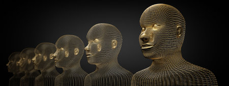 Many golden wireframe head shapes - 3D illustration