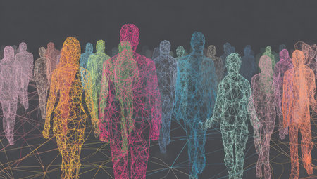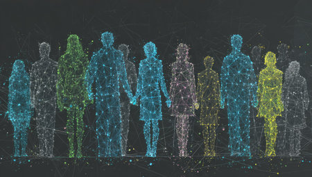 A vibrant digital mosaic of human silhouettes linked by luminous points, illustrating dynamic connections and the flow of information in a forward-looking digital re