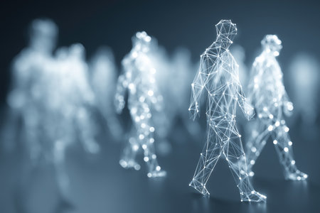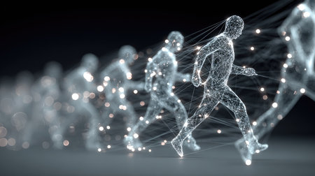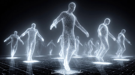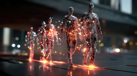 This captivating image showcases walking figures crafted from glowing particles, representing movement and technology in a digital realm.