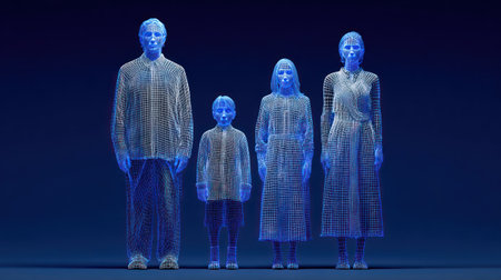 A digital illustration depicts a family of four, rendered in a translucent blue wireframe style. The figures stand together on a dark blue background. The composition features a front-facing perspective with soft lighting, suggesting a technological or futuristic theme, suitable for use in digital media and conceptual projects.