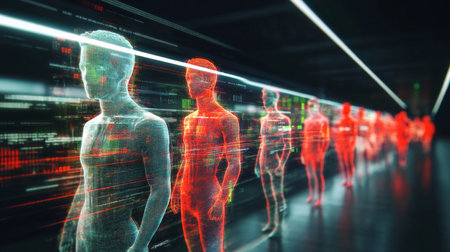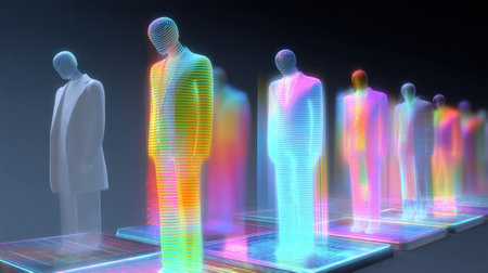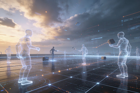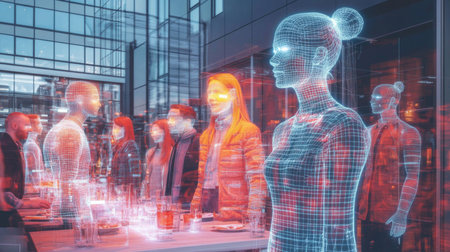 Holographic representations of agentic autonomy showcasing human-like figures in a futuristic setting evoking technology and innovation