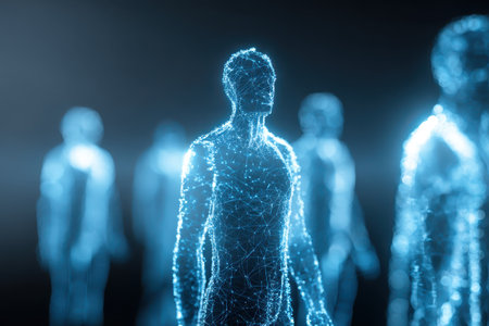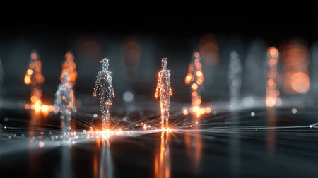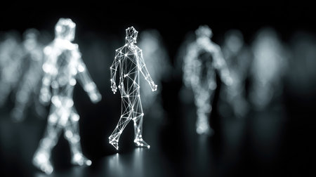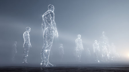 Futuristic Representation of Human Figures Created with Glowing Lines and Nodes in an Ethereal Setting Suggesting Technology and Innovation