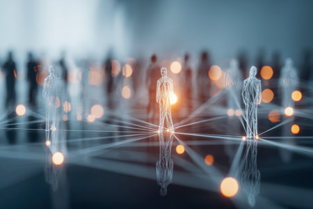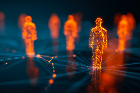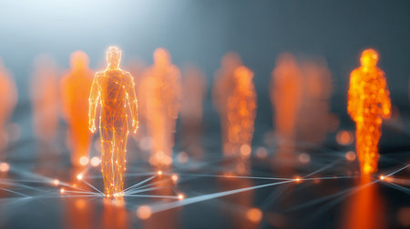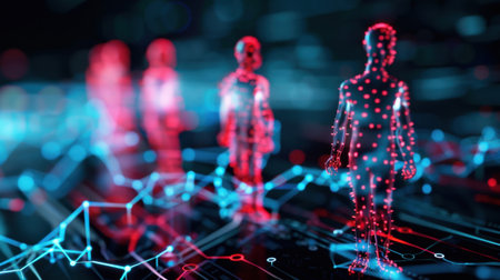 futuristic visualization of human silhouettes made from glowing network points, representing innovation, technology, and business networking. ai generated.