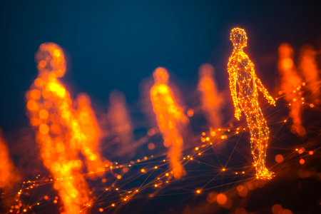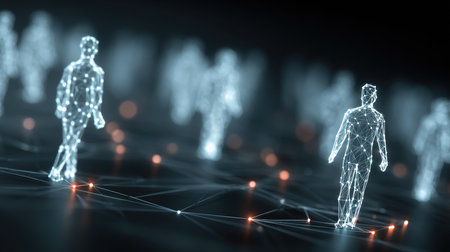 Abstract visual of human-like digital figures linked by illuminated lines on a dark background, symbolizing connectivity and tech networks.