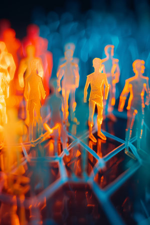 A vibrant display of luminous human silhouettes linked by intricate digital pathways, illustrating the interconnected nature of modern digital communication and team