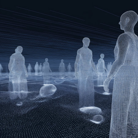 Wireframe human digital landscape data mesh holographic figures abstract representation network grid blue tones futuristic scene