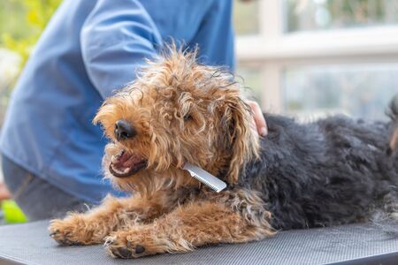 Groomer woman is trimming Puppy of Welsh Terrier Dog while the dog is playing with trimming comb in his mouth.