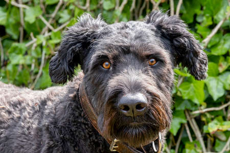 Close up of black Giant Schnauzer or Riesenschnauzer dog outdoor