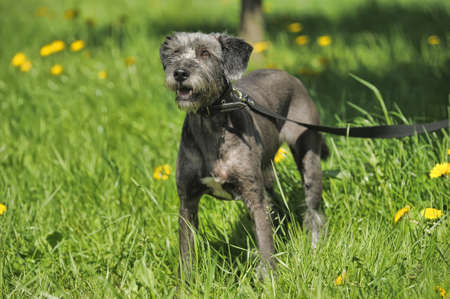 Portrait of a shaggy dog mongrel on a walk in the park on a sunny day