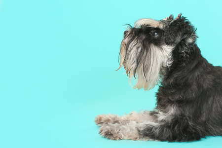 Standard Schnauzer, angry dog baring its teeth, studio lighting pastel background