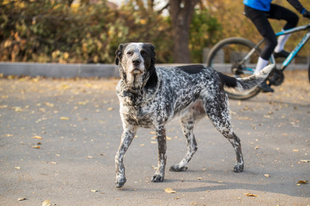 Old dog on street. Close up of dog. Old German Pointer pet dog animal. Cute dog portrait. Beautiful dog. City dog life. German Shorthaired Pointer.