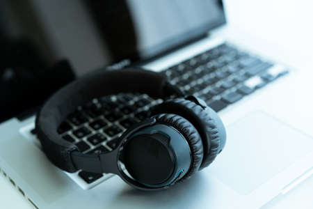 Modern wireless headphone left on laptop computer with copyspace. Headphones on the personal notebook computer. Relaxation after working.