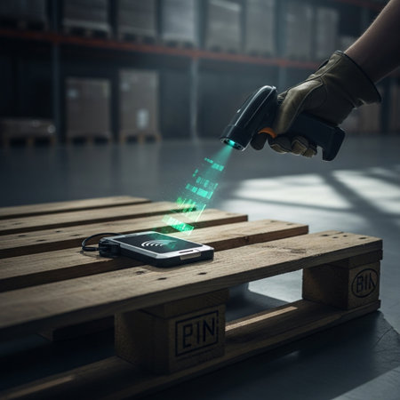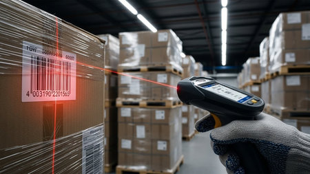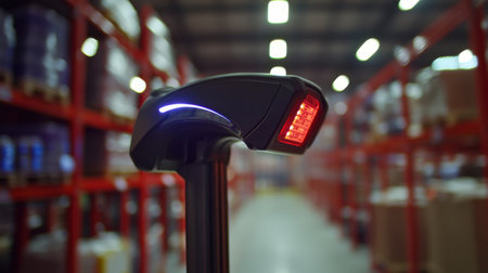 This image showcases a close-up view of a barcode scanner used in a warehouse setting, highlighting the device's red scanning light against a backdrop of organized boxes.