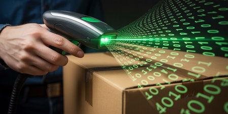 A hand holds a gray scanner emitting a green laser beam that reads binary code from a cardboard shipping box.