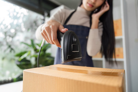 Close-up of e-commerce businesswoman scanning a package using a barcode scanner in a modern workspace.