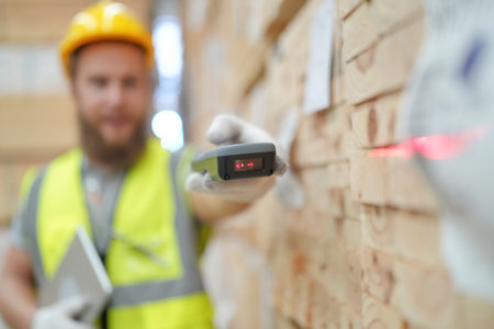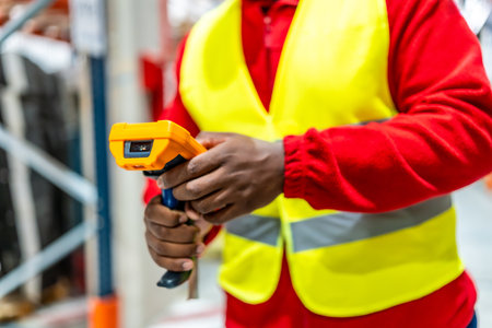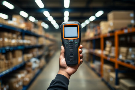 Close up of worker is using a electronic tool in a warehouse