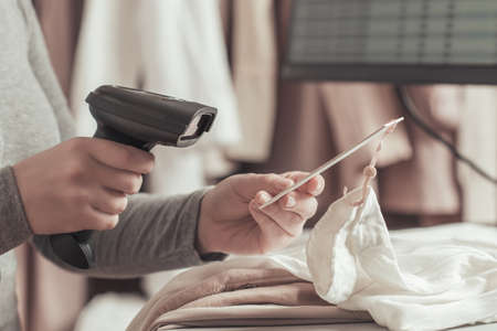Woman cashier, seller scanning and reading barcode from clothes using barcode scanner in female clothing store.