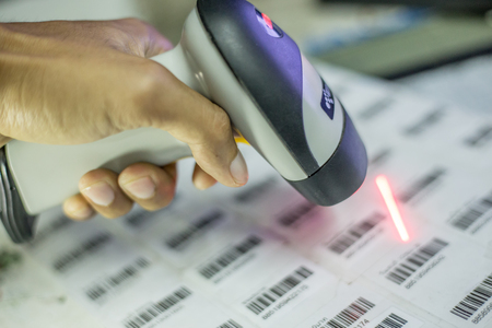 A man scanning a barcode, buying and selling concept. Scene. Close up of hand holding bar code scanner, scanning packages labels with laser on box.