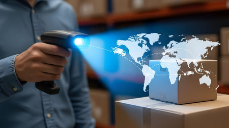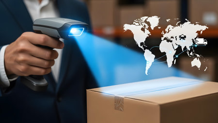 Hand holding scanner with blue light beam on package and global map overlay Clear details and vib...