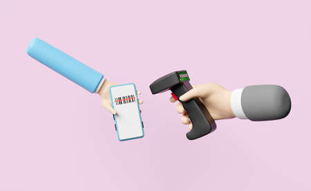 hands holding barcode scanner with mobile phone, smartphone isolated on pink background, 3d illustration or 3d render