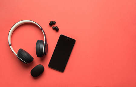 Stock photo of a big and small wireless headphones and a smartphone to listen to music on a red background and space for copy text at right