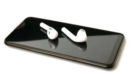 Tula Russia 13.04.2020 Phone with airpods on the desk isolated.