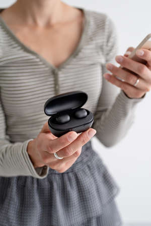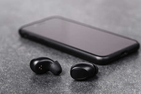 Pair of black true wireless earbuds with smartphone. Relaxation concept.