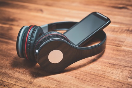A Wireless Listen Music Concept With A Black Smartphone Leaning On Against Black Overhead Headphone On A Wooden Table