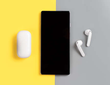 Smartphone and white wireless earphones with the case top view on grey and yellow background