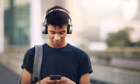 Shall we meet up later. a handsome young man waking down the street and listening to music off his cellphone.