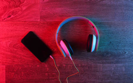 Headphones and smartphone on a wooden floor with a neon red-blue gradient glow. Top view